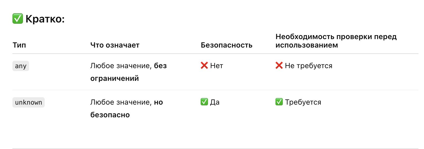 - Тип unknown говорит: «Я не знаю, что это за тип, пока ты не проверишь».